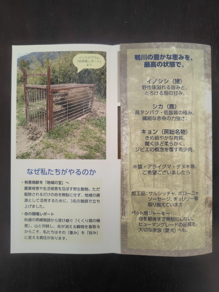 野性動物は農作物へ被害をもたらし、駆除対象であるもその大半が廃棄されてしまっているという現状がある中で、頂く命を最後まで大切に、そして地域の資源として活用するためにできたこちらの施設。