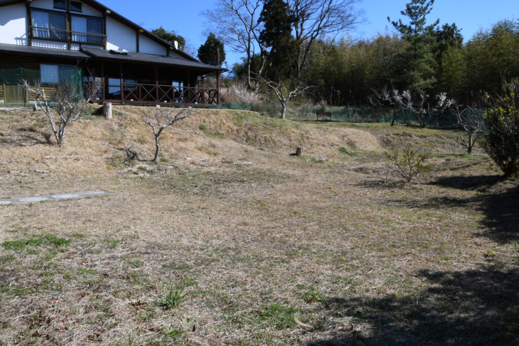 雄大な伊予ヶ岳やログハウスを見上げる下段は、わんちゃんが思いっきり駆け回るのに十分な広さ。
